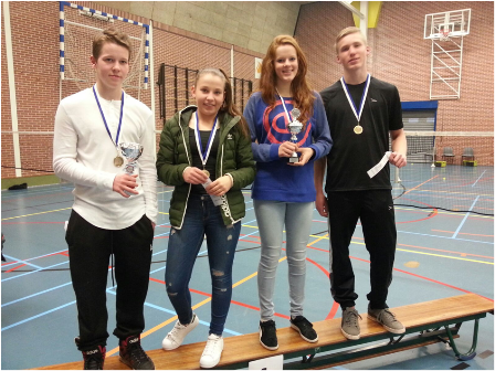 Na het recent behaalde kampioenschap van afdeling 5 van Regio Oost mocht de J1 van Shuttle Up ’81 zich gaan meten met de kampioenen van de andere afdelingen. Dit kampioenschap van Oost Nederland werd dit weekend gehouden in de sporthal van ELO United in Hengelo. Onder een flinke publieke belangstelling werden in totaal 15 partijen gespeeld tegen de teams van Didam BC J1, BC MOT ’79 J1 uit Almelo en BC Flits J1 uit Wierden. Alle drie de wedstrijden werden met 5 – 0 gewonnen en dat betekent dat Shuttle Up ’81 J1 uit Aalten de meer dan terechte vertegenwoordiger is voor de regio Oost op het NK Badminton 2016. Dit toernooi zal op 18 juni worden gehouden in Zutphen. Zij zullen daar strijden met de overige regio kampioenen van Nederland om de landstitel in U17 categorie!